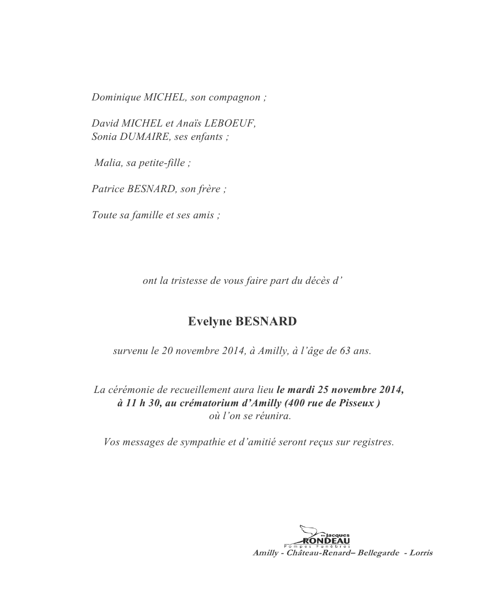 Décédée à Amilly (45200, France) le jeudi 20 novembre 2014 à l'âge de 63 ans