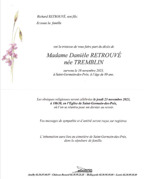 Décédée à Saint-Germain-des-Prés (45220, France) le samedi 18 novembre 2023 à l'âge de 89 ans
