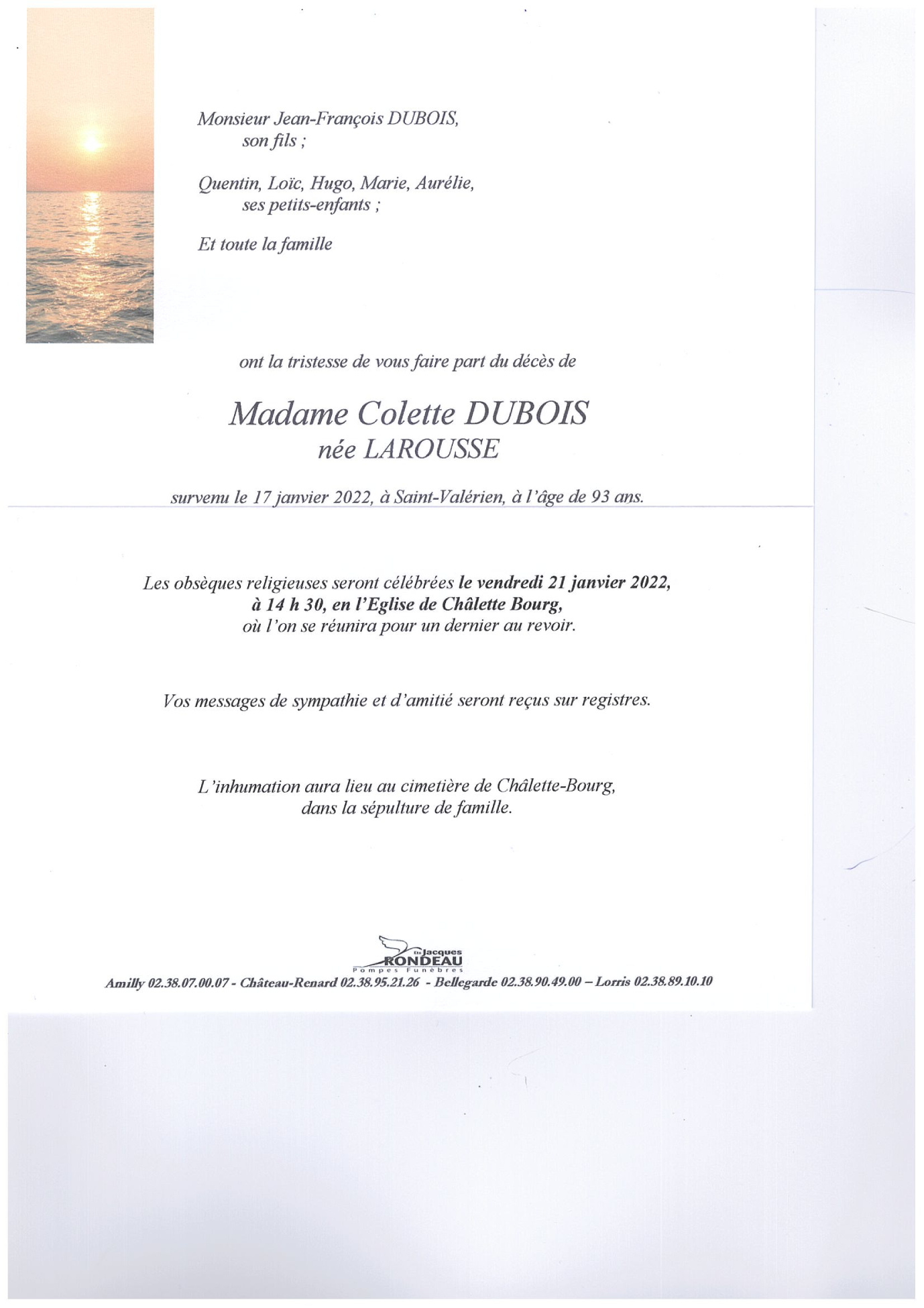 Décédée à Saint-Valérien (89150, France) le lundi 17 janvier 2022 à l'âge de 93 ans