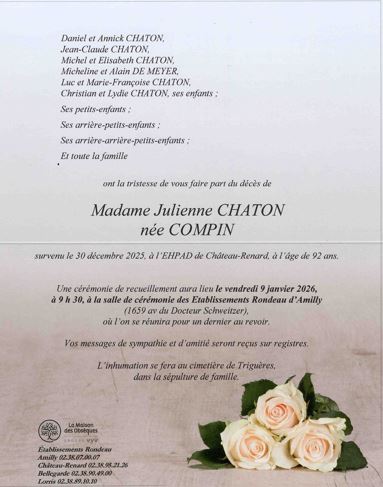 Décédée à Château-Renard (45220, France) le mardi 30 décembre 2025 à l'âge de 92 ans