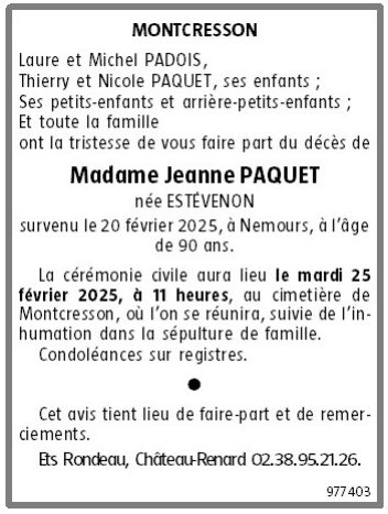 Veuve de Monsieur Pierre PAQUET