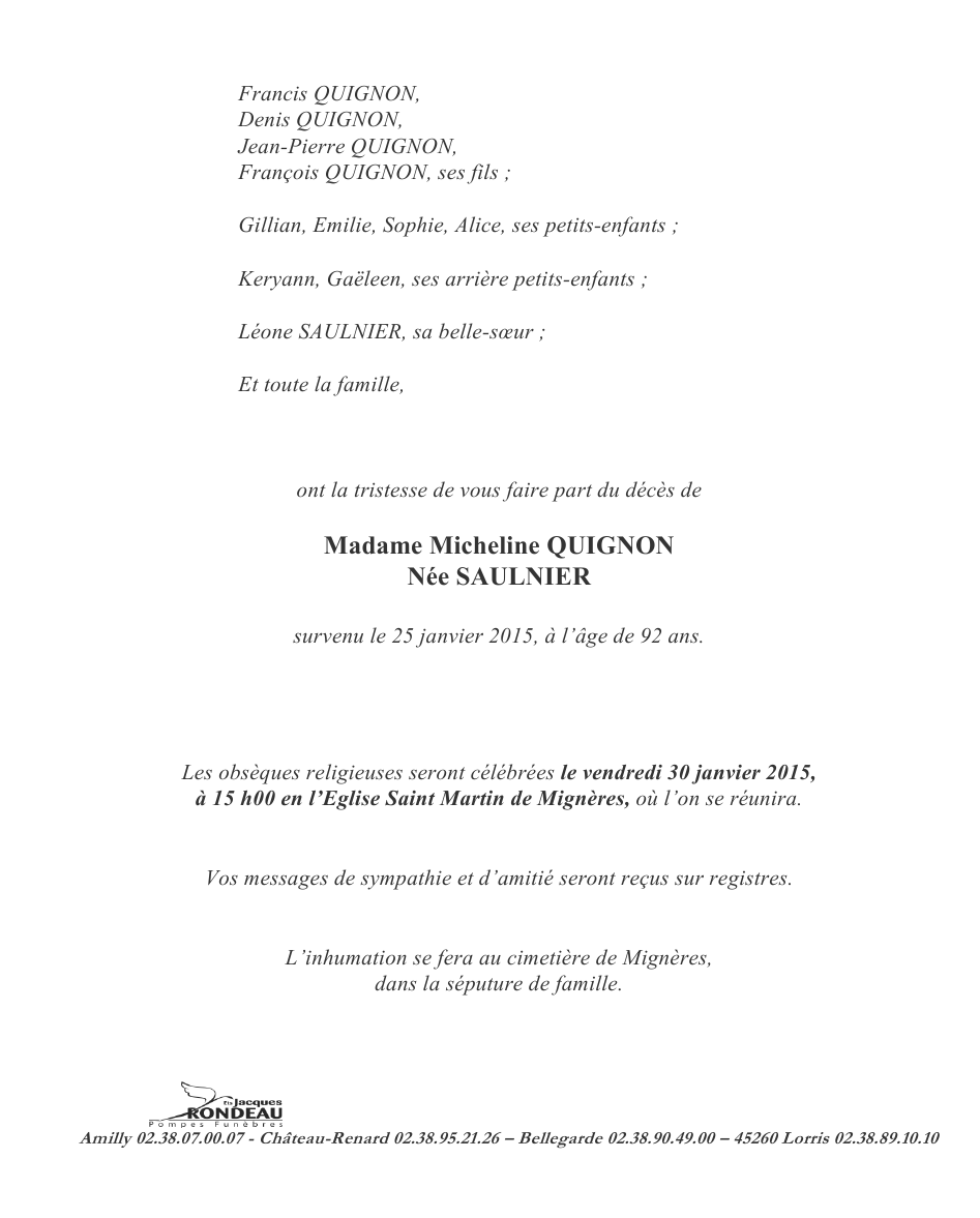 Décédée à Pithiviers (45300, France) le dimanche 25 janvier 2015 à l'âge de 92 ans