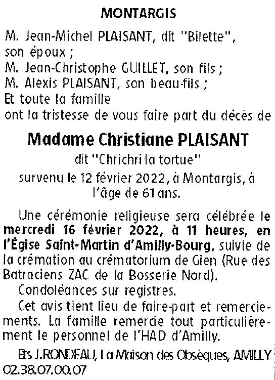 Décédée à Montargis (45200, France) le samedi 12 février 2022 à l'âge de 61 ans