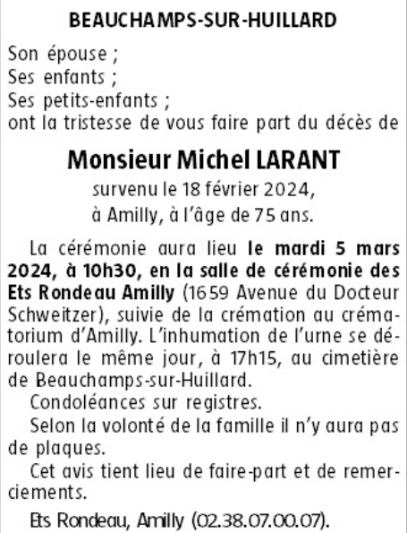 Décédé à Amilly (45200, France) le dimanche 18 février 2024 à l'âge de 75 ans