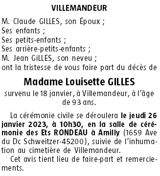 Décédée à Villemandeur (45700, France) le mercredi 18 janvier 2023 à l'âge de 93 ans