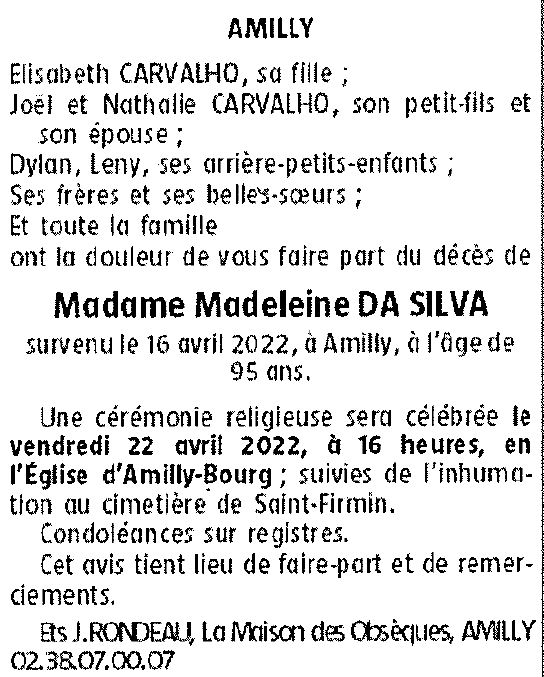 Veuve de Monsieur Milton DA SILVA CARVALHO
