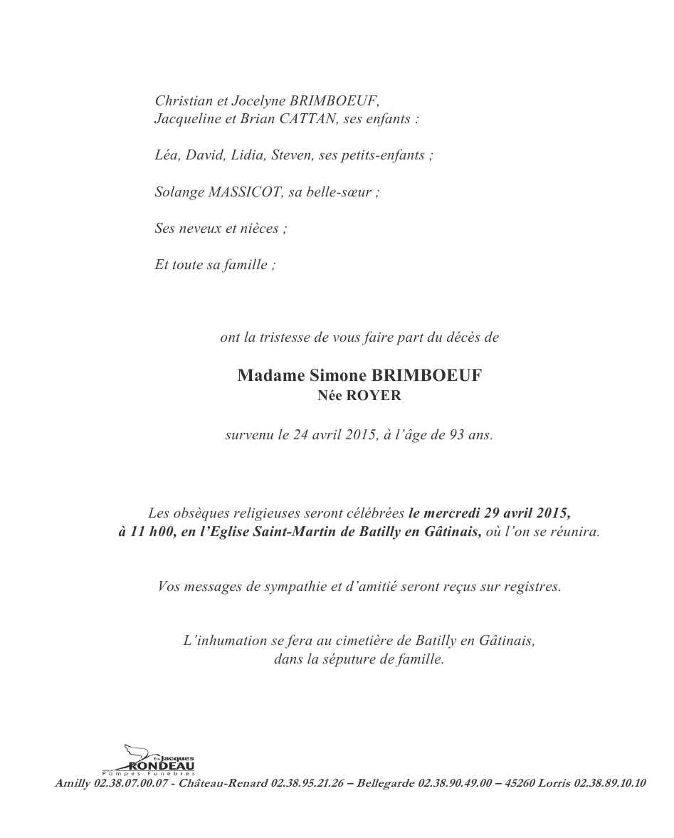 Décédée à Bellegarde (45270, France) le vendredi 24 avril 2015 à l'âge de 93 ans