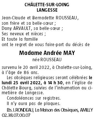 Décédée à Châlette-sur-Loing (45120, France) le mercredi 20 avril 2022 à l'âge de 86 ans
