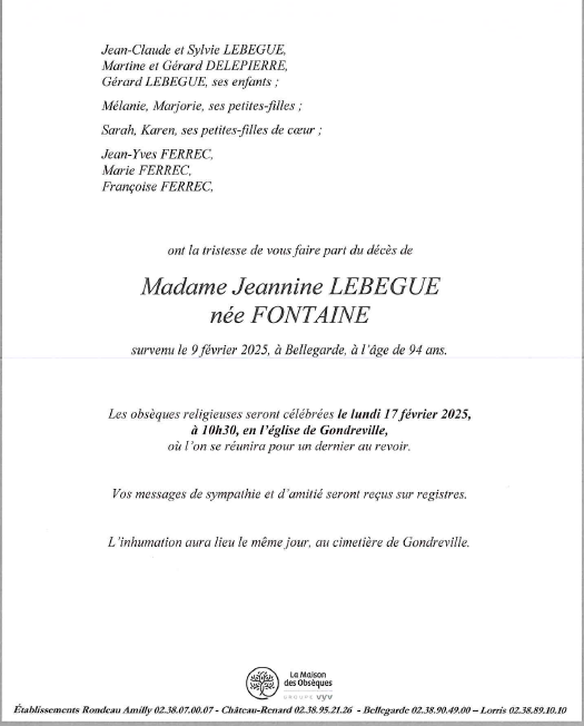 Décédée à Bellegarde (45270, France) le dimanche 9 février 2025 à l'âge de 93 ans